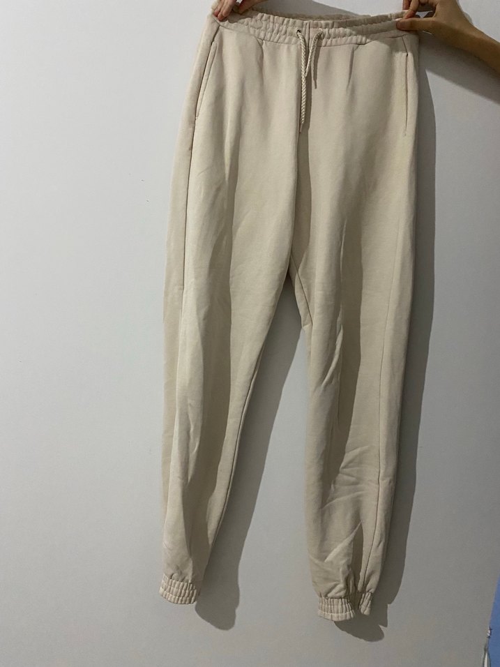 Yumuşak keten kumaştan, lastikli bel ve paçalarla bej salaş kesim eşofman altı. Günlük rahat sokak stili için ideal. ️