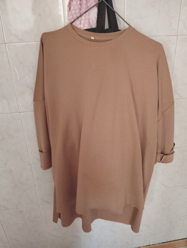 Bej renkli, salaş kesim, keten kumaştan kadın tunik. Bisiklet yaka ve uzun kolludur, midi boyda, minimalist ve desensiz tasarıma sahiptir.