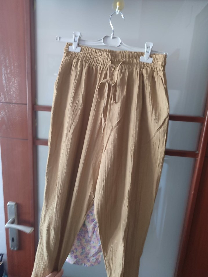 Bej renk, keten kumaştan, salaş kesim ve midi boyda, drapeli kadın pantolon, gündelik rahat sokak stili için uygun.