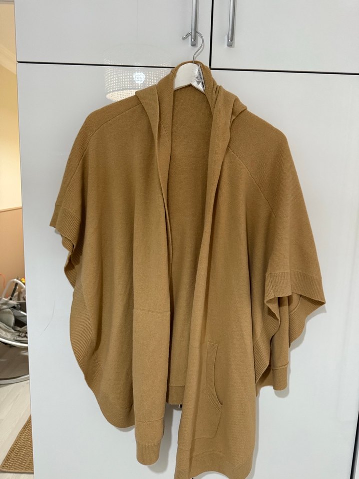 Bej renk, salaş kesim kadın pelerin. Uzun kollu, bisiklet yaka ve midi boyda, rahat ve şık kullanıma uygun.