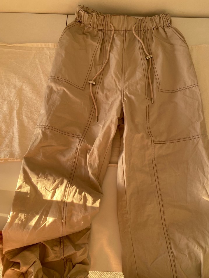 Bej renkli, salaş kesim keten pantolon. Elastik bel ve bağcık detaylarıyla günlük sokak stili için uygun. Parlak dokulu.