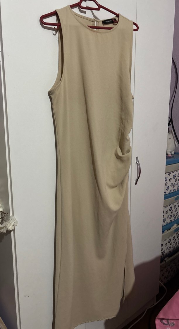 Bej uzun elbise, kolsuz ve yüksek yakalıdır. Salaş kesimi ve drapeli detaylarıyla minimalist tarzda günlük kullanıma uygundur.