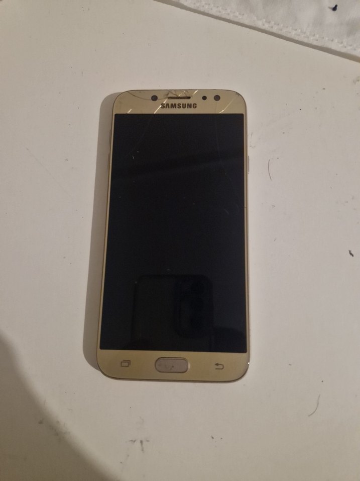 Bej renkli gövdeye sahip Samsung Android akıllı telefon, ön kamera ve ekran altında fiziksel navigasyon tuşları bulunmaktadır.