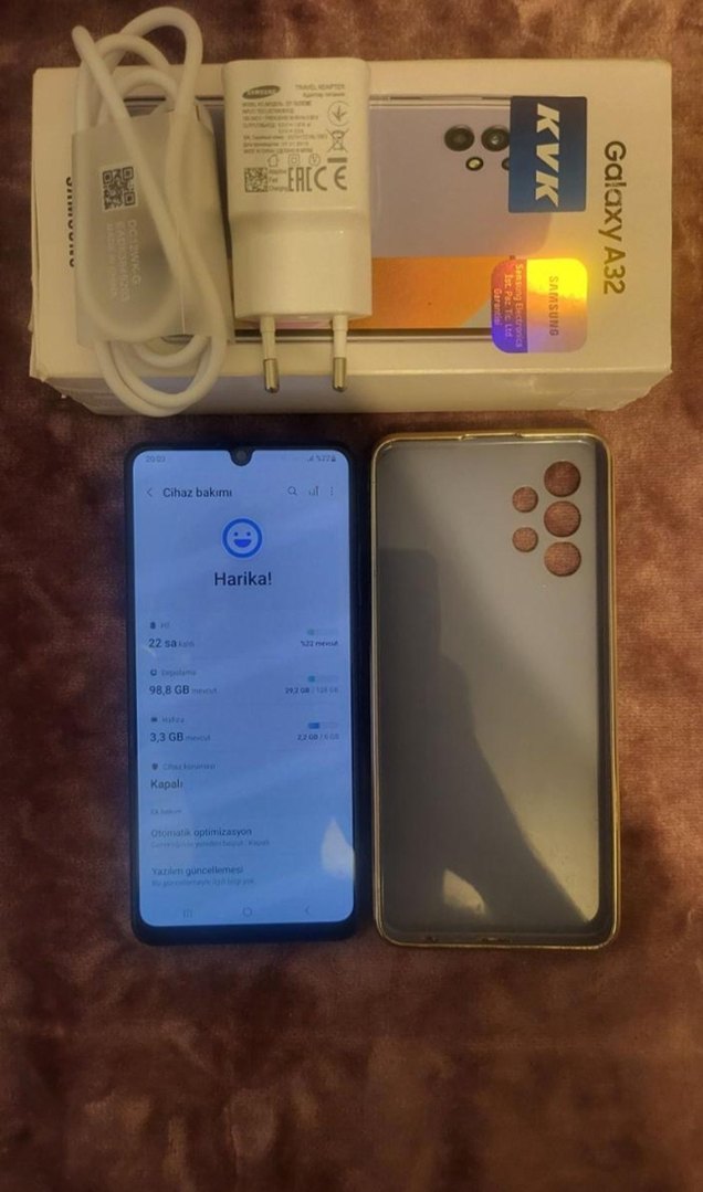 Bej Samsung Galaxy A32 Android telefon, şarj cihazı ve koruyucu kılıf ile birlikte gelir. Ekranda cihaz bakım durumu olumlu şekilde gösterilmiştir.