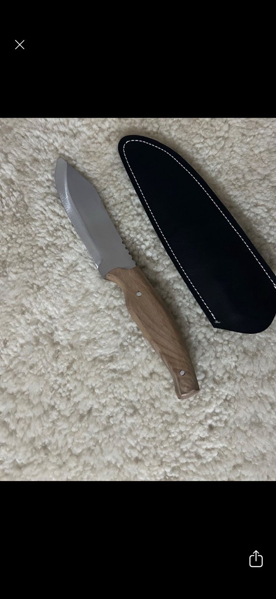 Bej renkli ahşap saplı gri bıçak ve siyah koruyucu kılıf. Sap, rahat kullanım için doğal bir tutuş sağlar. 23.5 cm