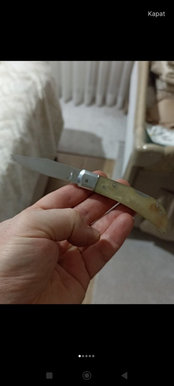Bej saplı ve gri bıçağı olan katlanabilir bıçak. Basit ve kompakt tasarıma sahiptir.sadece bucağın sağ yüzeyinde etiket tarzı bi iz var kece ile cıkabilir sıfır ürün hiç kullanmadım.