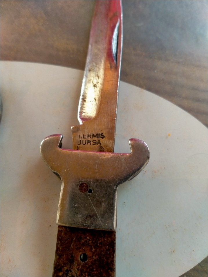 Parlak metal bıçağın üzerinde "BURSA, 1.ERMIS" yazısı bulunur. Bej sapı ve kullanılmış görünümüyle dikkat çeker. Eski çakı ve cocacola açacak ikiside eski ürün bu haliyle satılık