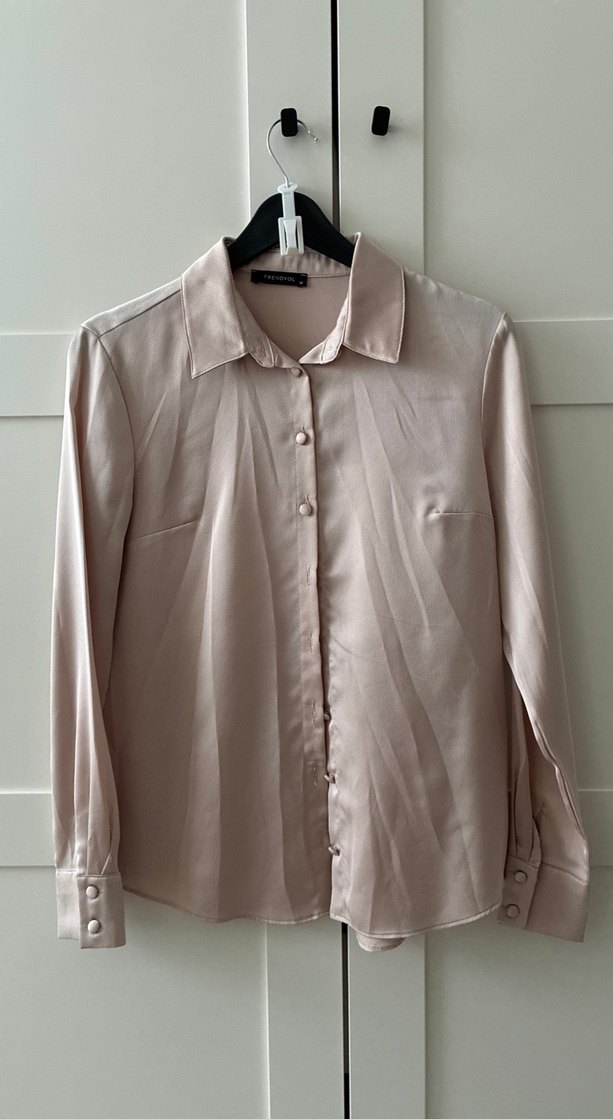 Bej renginde, saten dokulu, düğmeli ve yakalı kadın gömleği. Uzun kollu ve bol kesimdir, parlak ve pürüzsüz bir yüzeye sahiptir.