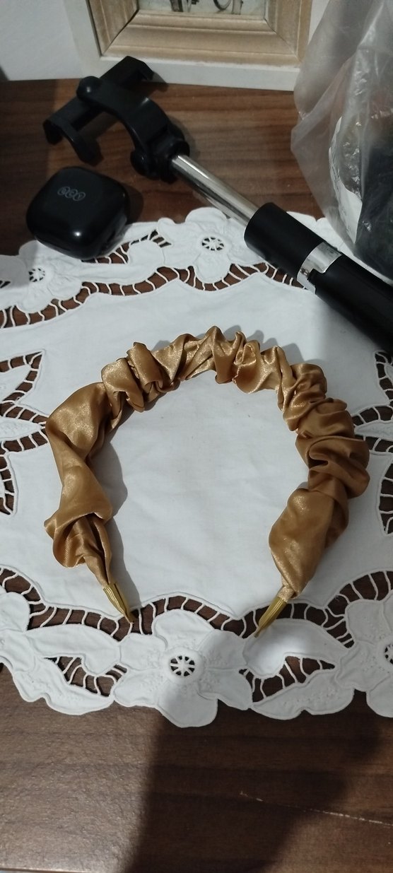 Bej saten malzemeden yapılmış, fırfırlı tasarıma sahip, parlak bohem tarzda bir taç. Minimalist ve modaya uygun stiller için ideal. ✨