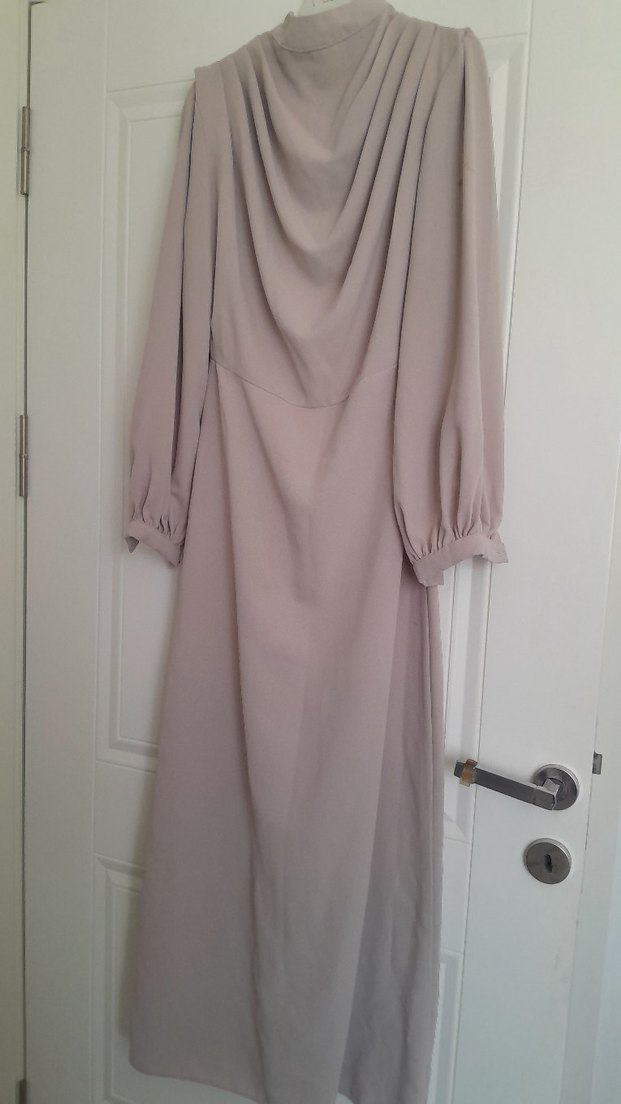 Bej renkli, parlak ve saten görünümlü kumaştan yapılmış tesettur elbise Drapeli tasarımı, uzun kollu ve normal boyda, bol kesimdir. ✨
