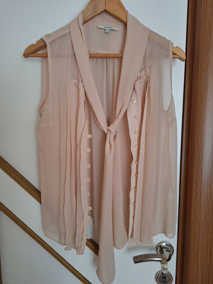 Bej renk, saten dokulu, halter yakalı ve düğmeli ön detaylı, salaş kesim midi boy kolsuz bluz. Ofis için şık ve rahat bir tercih.38 -40 bedene uygun