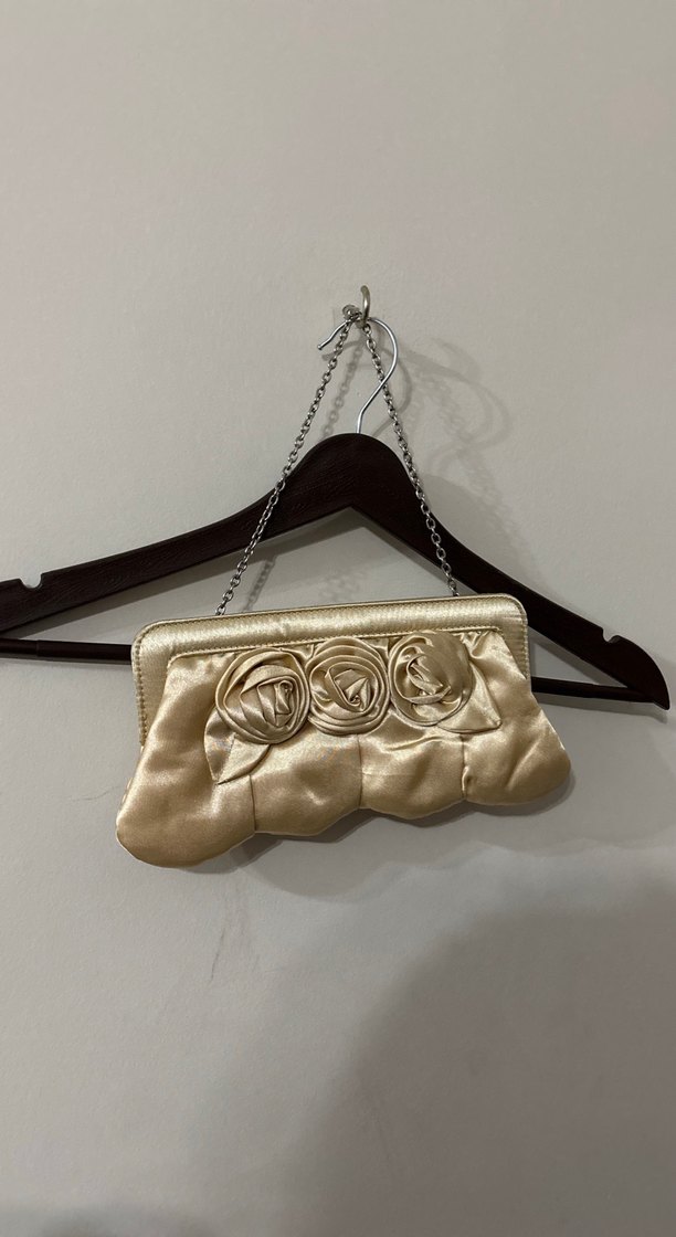 Bej saten dokulu kadın çanta, çiçek desenli fırfır detaylarıyla düğün ve klasik tarz etkinlikler için uygun.