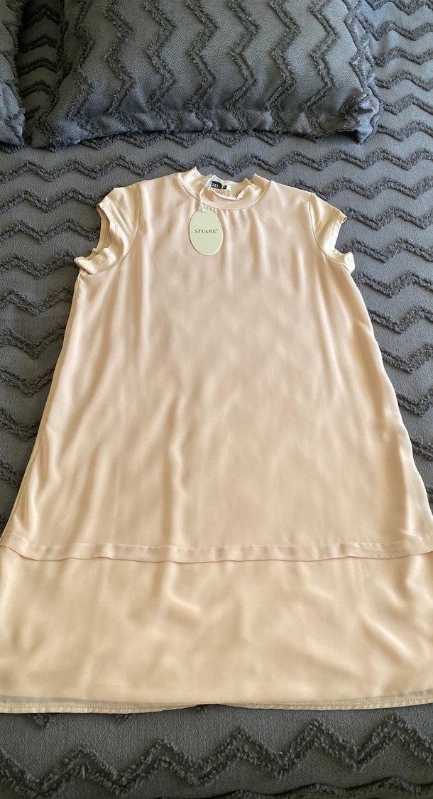 Bej renkli, kısa kollu, yuvarlak yakalı tunik. Saten dokusu ve midi boyu ile rahat ve şık bir görünüm sunar.