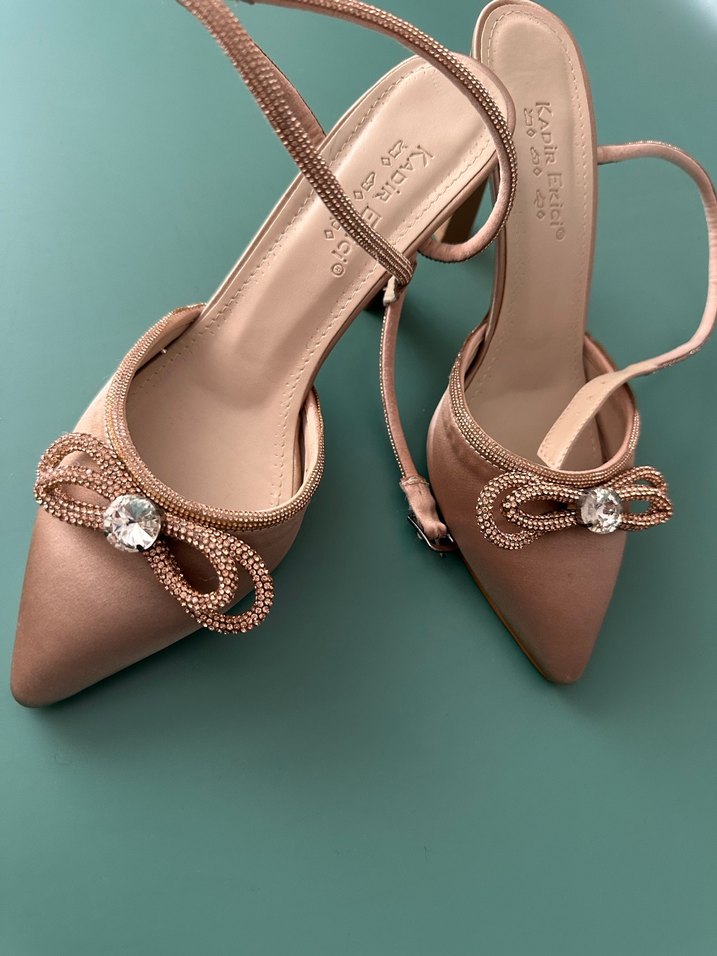Bej saten stiletto topuklu kadın ayakkabı, nakışlı detaylar ve tokalı askılar içerir. Parlak, çağdaş tarzıyla düğünler için uygundur.