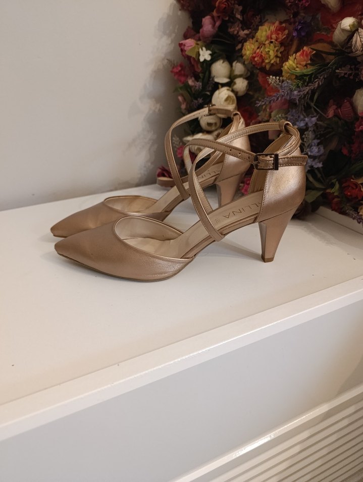 Bej saten tokalı yüksek topuklu kadın ayakkabısı, modern klasik tasarımlı ve düğünlere uygun. Açık renk ve desensiz stiliyle zarif.