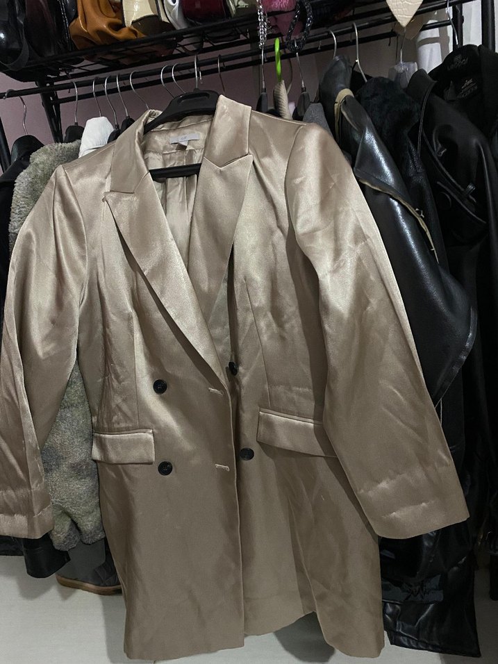 Bej renkli, parlak ve ipeksi kumaştan yapılmış, düğmeli uzun kollu blazer ceket. Notch yaka ve uzun kesimiyle rahat bir regular fit sunar. ✨bir ya da iki defa giyildi