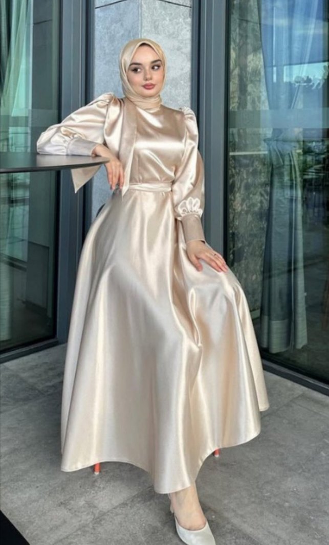 Bej saten kumaştan, uzun kollu ve kayık yaka olan bu uzun abiye elbise, drapeli tasarımı ve regular fit kesimiyle düğünler için uygundur. ✨