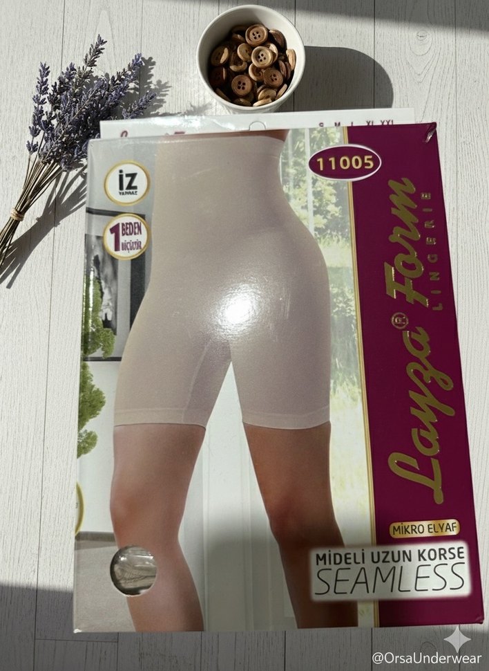 Yumuşak mikroelyaf kumaştan, bej renkli, baskılı seamless mini korse. Uzun mideli korseli tasarımıyla düzgün bir oturuş sağlar. 1 beden inceltir beden L-xl