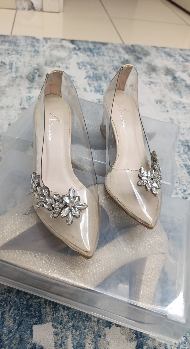Bej renkte, şeffaf cam görünümlü malzemeden yapılmış, taşlı çiçek süslemeleri ve modern klasik desenli yüksek topuklu abiye ayakkabı. Düğünler için uygun.