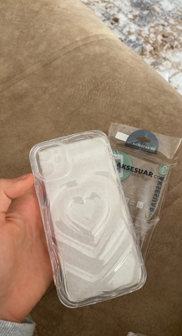 Bej renkte, şeffaf ve hafif malzemeden üretilmiş sokak stili telefon kılıfı. Paket üzerinde "KSESUAR" yazısı bulunmaktadır.