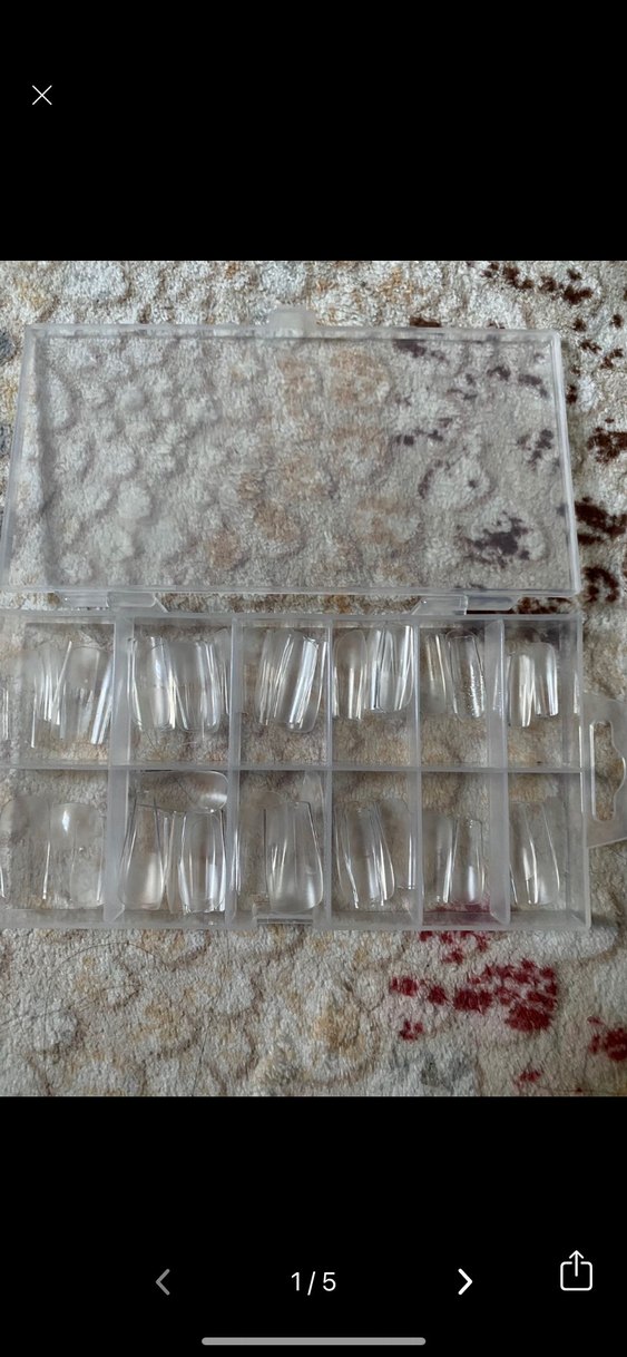 Bej şeffaf tırnak takma uçları, kolay seçim için bölmeli plastik kutuda düzenlenmiştir. Tırnak süslemeye uygundur.