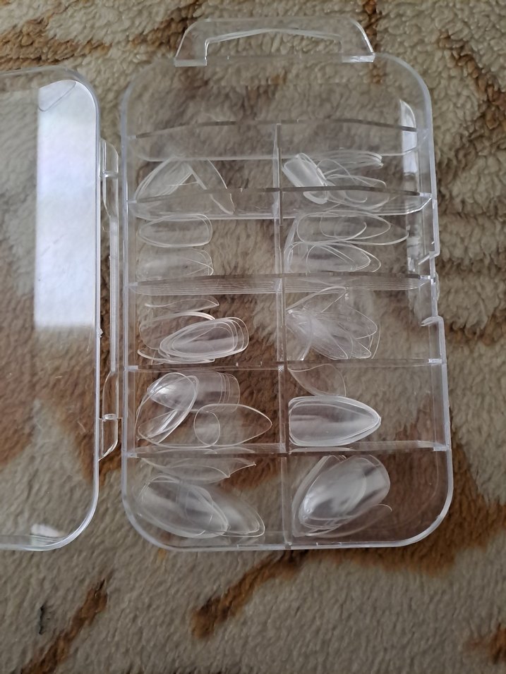 Çeşitli boylarda bej şeffaf tırnak uçları, kullanımı kolay şeffaf plastik kutuda düzenlenmiştir.