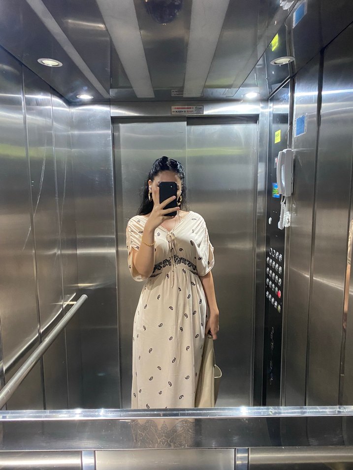 Bej renginde, V yaka ve ince askılı, bol kesim uzun elbise. İpeksi, şeffaf kumaş ve batik desen içerir. Bohem tarz için uygundur.