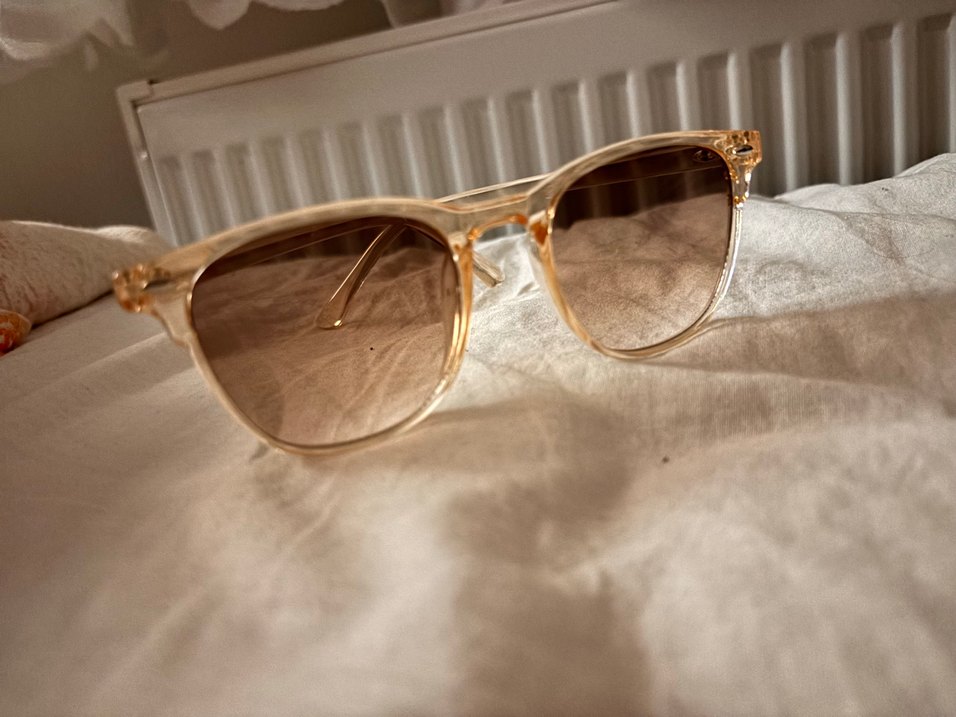 Bej renkte, şeffaf ve parlak çerçeveli vintage tarzında kadın gözlüğü, klasik zarafet sunar. ️