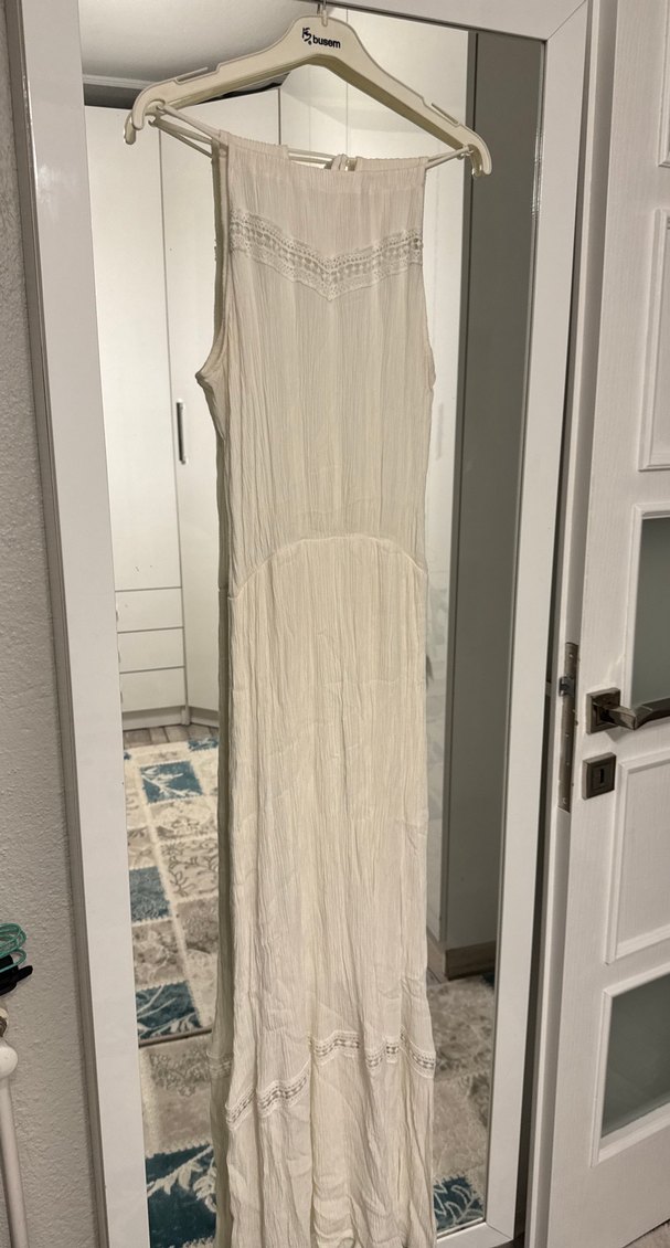 Şile bezi kumaştan, ekru renkte, kolsuz, bol kesim ve drapeli uzun elbise. V yakalı, bohem tarzda, günlük kullanım için uygundur. İçi astarlıdır.