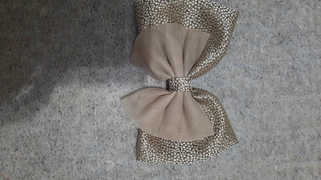 Bej renkte, simli dokulu sentetik kumaştan yapılmış, fiyonk detaylı saç aksesuarı.