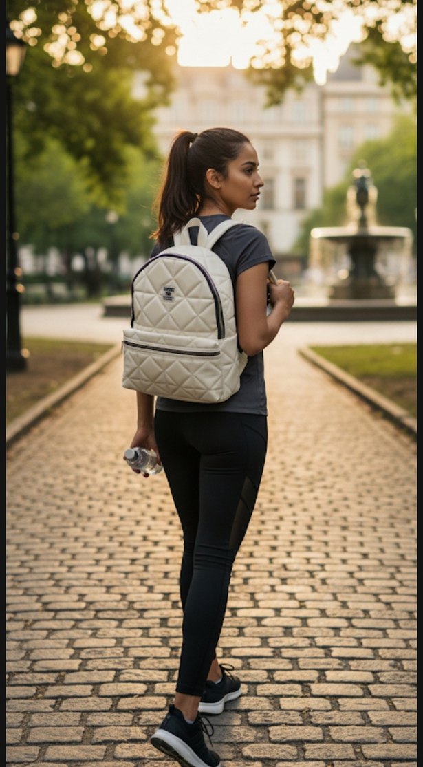 Sentetik kumaştan yapılmış, bej renkli ve şişme tasarımlı, desensiz gri tonlarda kadın sırt çantası. Günlük kullanım için uygun, rahat sokak stiliyle uyumlu.