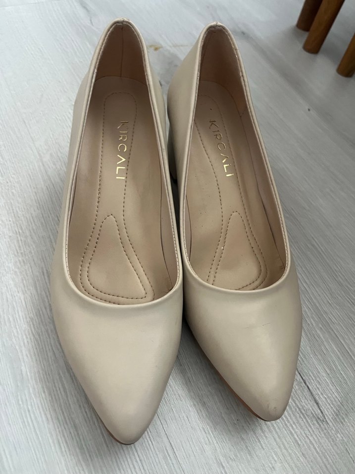 Bej renkte, sivri burunlu ve modern klasik stilettolar. Kauçuk malzemeden yapılmış, ofis için zahmetsiz şıklık sunar, desensiz ve açık renklidir.