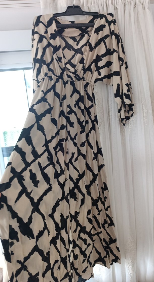 Bej renkte, siyah bağlama desenli uzun elbise. Salaş kesim, drapeli ve askılı kolları ile V yaka detayına sahiptir. Günlük kullanım için uygundur. Ben L kullanıyorum ..
