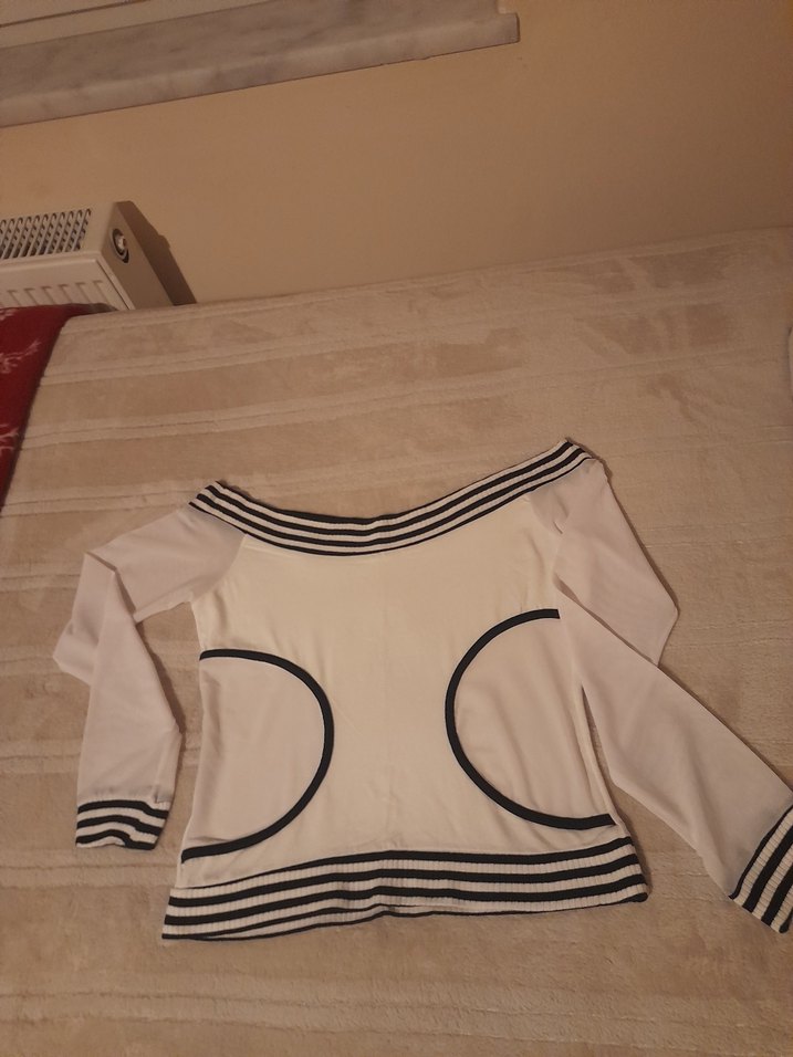 Düz bej renk ve siyah çizgilerle detaylandırılmış, uzun kollu, kısa kesim, tekne yaka kadın bluz. Yumuşak sentetik kumaştan örme detaylı, günlük sokak stiline uygun bir parça.