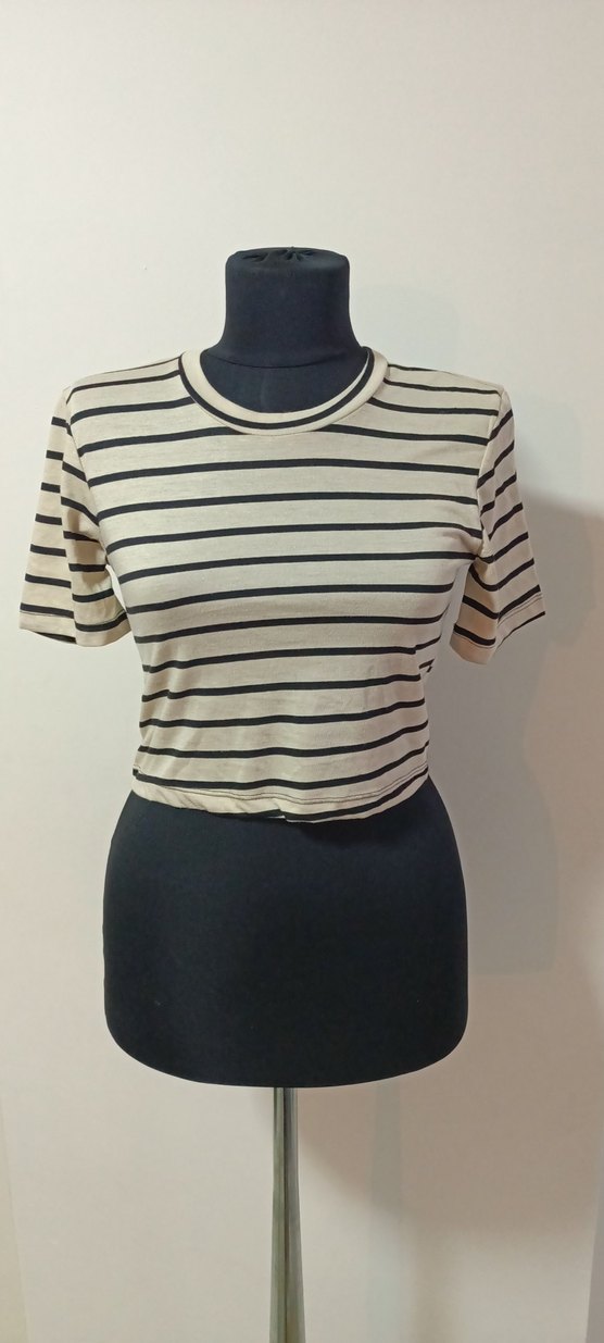 Bej renkli, siyah çizgili, kısa kollu ve yuvarlak yakalı crop top. Sentetik kumaştan yapılmış, rahat ve şık bir görünüm sunar.