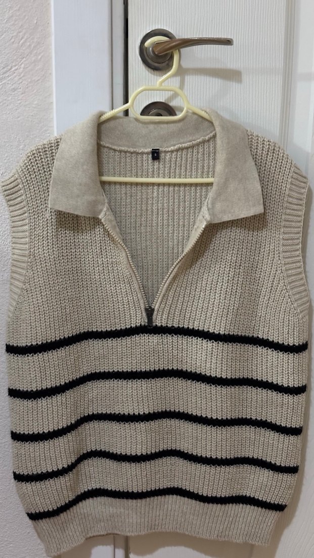 Bej renkli, siyah yatay çizgili, yakalı kolsuz örgü kazak. Rahat kesim ve midi boy, günlük sokak stili için uygun.