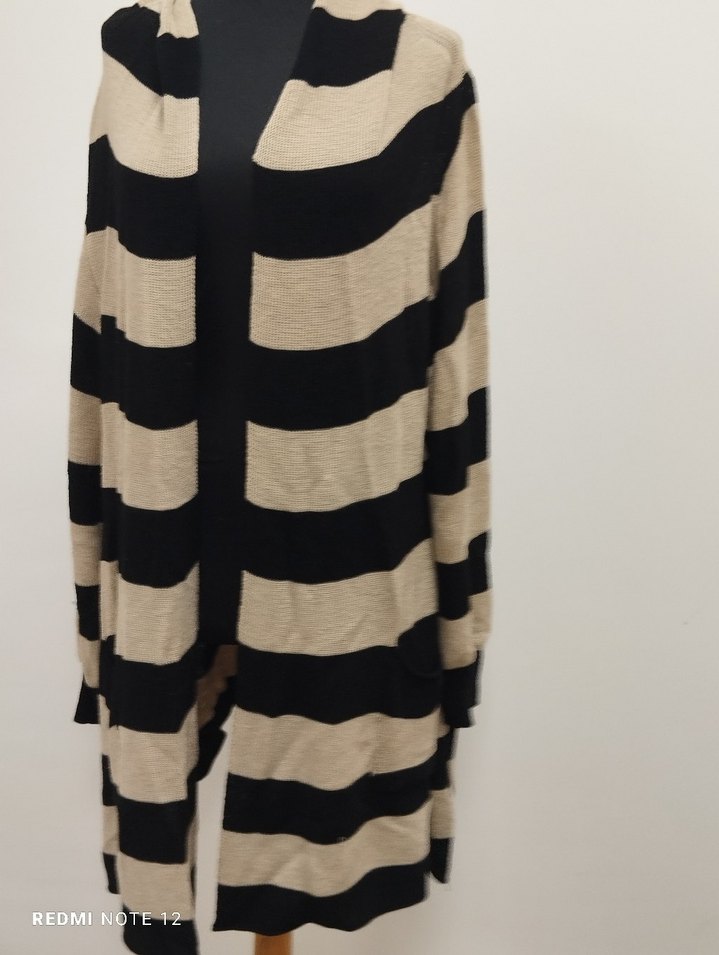 İki kol arası 58 cm. kol boyu 67 cm. uzunluk 90 cm. Uzun, bol kesim kadın hırka, uzun kollu ve kayık yaka. Yün örme kumaştan, koyu bej ve siyah çizgili rahat tasarım, günlük kullanıma uygun.