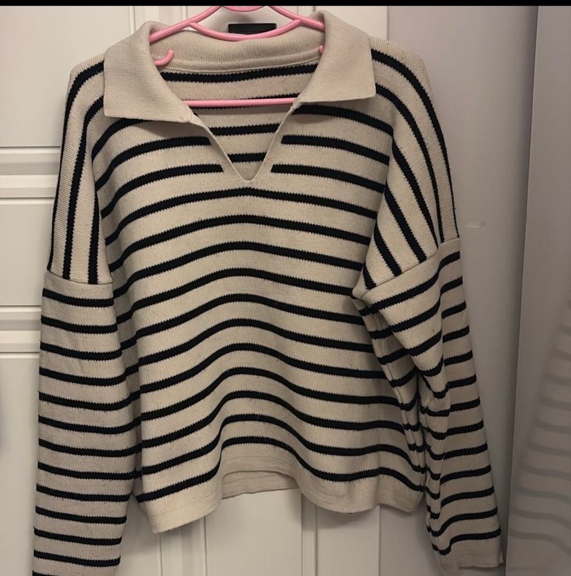 V yaka ve uzun kollu, bol kesim kadın triko kazak. Bej ve siyah çizgili, rahat ve günlük sokak tarzına uygun. M/L bedene uygun olucaktir. S da oversize durur
