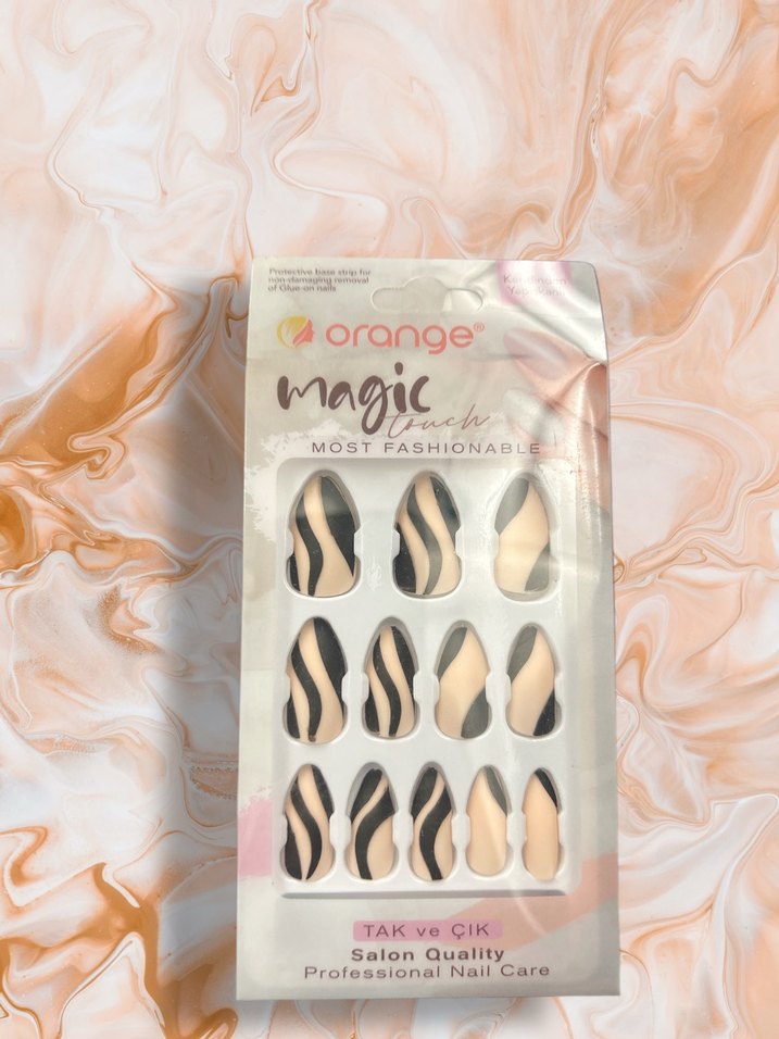 Bej renkli, siyah dalga desenli tırnak süsü. Kolay takılıp çıkarılabilen, salon kalitesinde profesyonel tırnak bakımı ürünü.