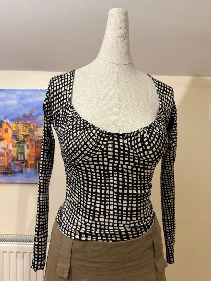 Bej Siyah Desenli Uzun Kollu Kadın Bluz
