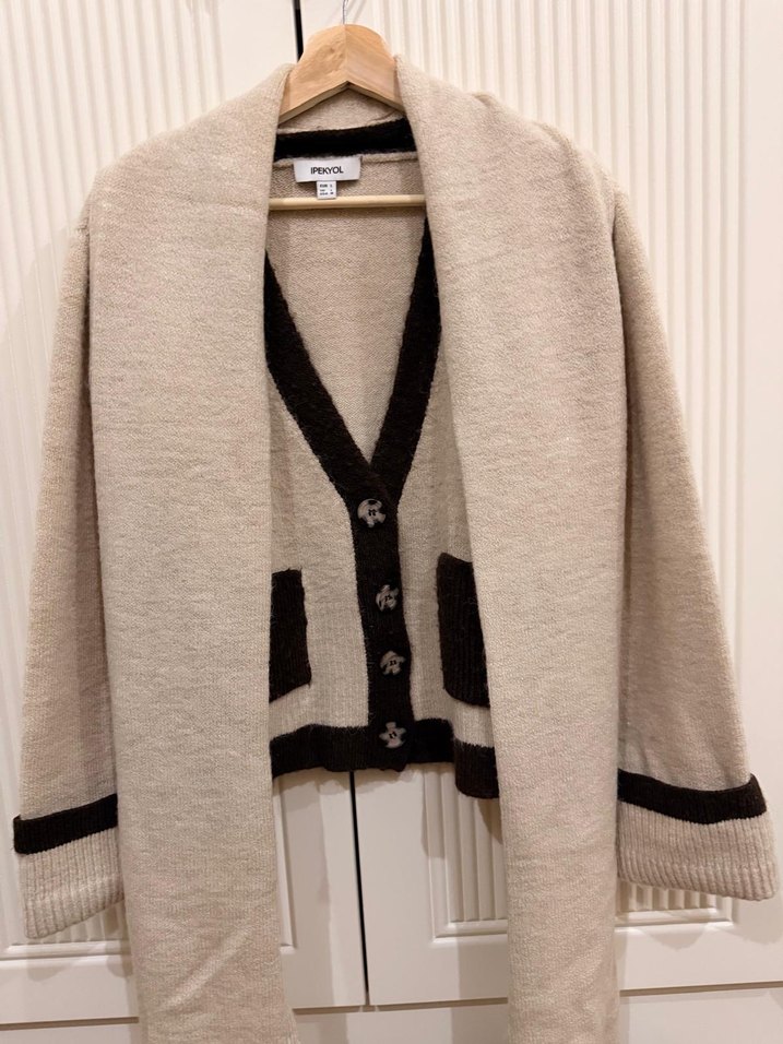 Bej renkli yün örgü kadın hırka, bol kesim, uzun kollu ve yaka detaylıdır. Siyah şeritler ön, cep ve manşetlerde bulunur, rahat ve günlük kullanıma uygundur.