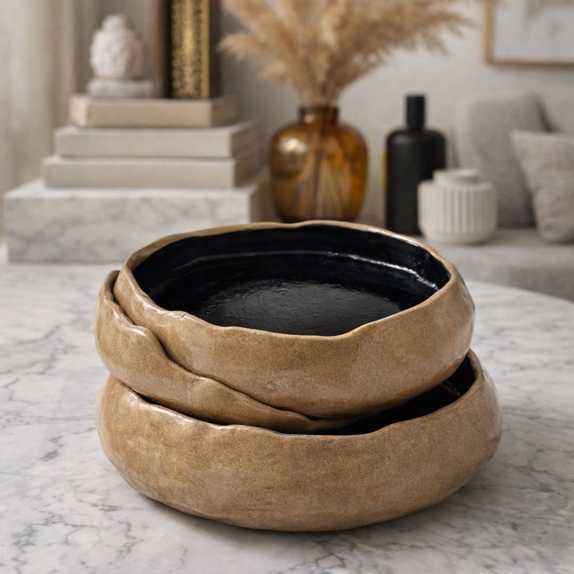 Bej dış yüzeyli ve koyu siyah iç kısmı olan, desen içermeyen modern tabak seti. Rustik ve sade tasarım öne çıkar. ️