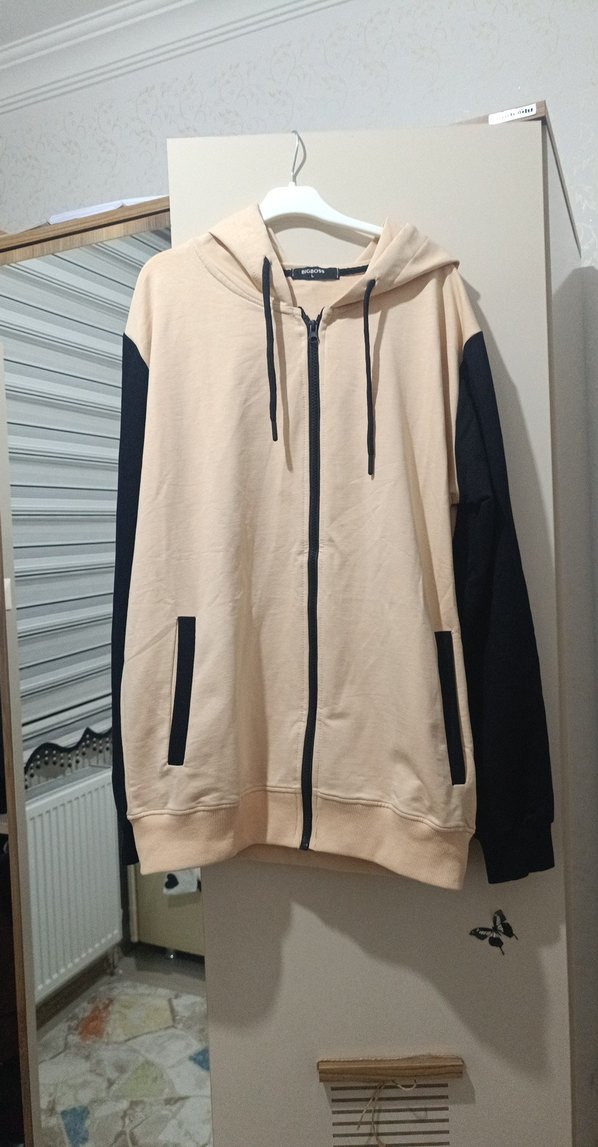 Bu erkek sweatshirtü, kapüşonlu ve fermuarlı tasarımıyla bol kesimdir. Bej renkli yumuşak kumaş ve siyah kollarıyla günlük rahat kullanıma uygundur.