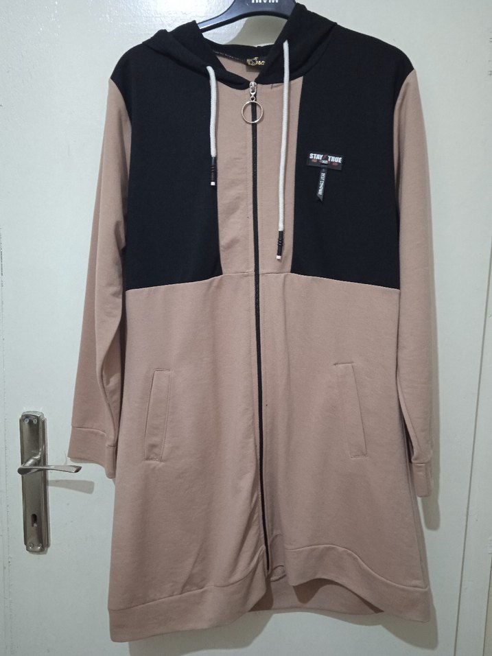 Bej ve siyah renklerde, uzun ve kapüşonlu kadın ceketi. Bol kesim, uzun kollu, fermuarlı ve cep detaylıdır. Sentetik kumaştan üretilmiştir.