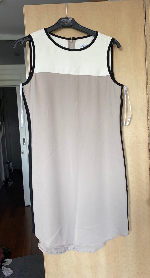 Bej renkte, siyah kenarlı, kemerli, kol kısmı açık midi elbise. Ofis kullanımına uygun, sentetik yumuşak dokulu kumaştan yapılmıştır.