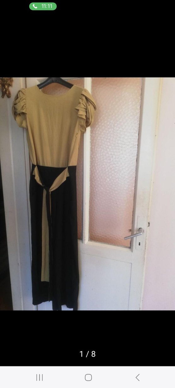 Bej renkli, kruvaze yakalı, fırfırlı askılı kollara ve siyah kuşaklı bele sahip uzun elbise. İpeksi kumaşıyla ofis için şık bir tercih.