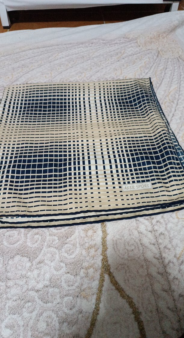 Kadınlar için pileli, bej ve siyah kareli desenli fular. Yumuşak sentetik kumaştan, bohem ve retro tarzlara uygun, Paris havası taşıyor. fotoğrafını çekmişim birkaç yerinde ip çekilmesi var