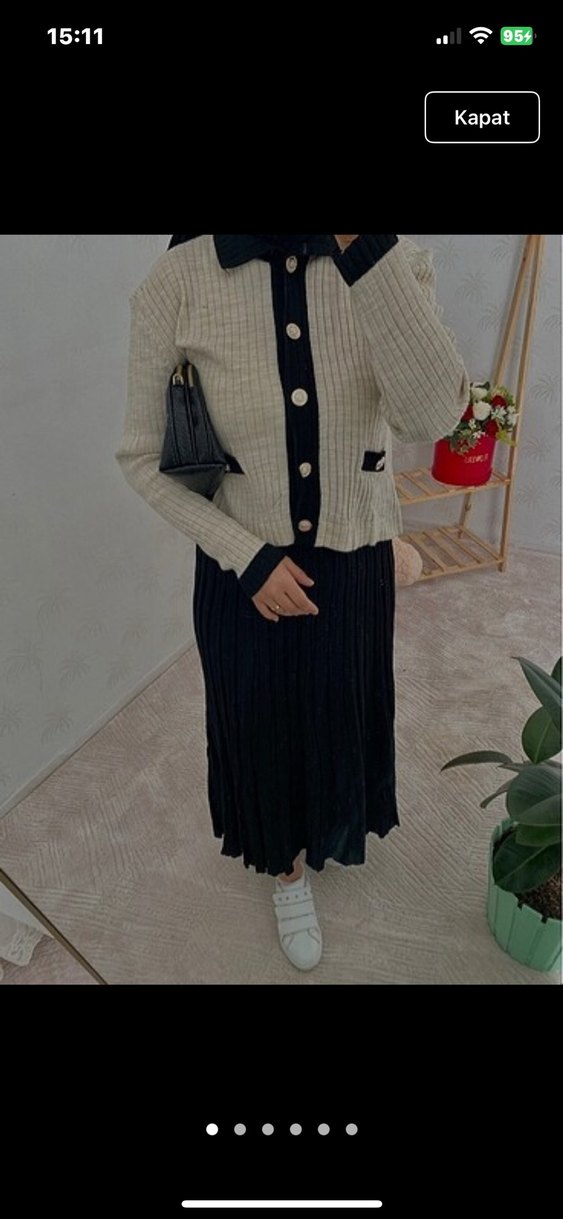 Bej uzun kollu, yakalı ve düğmeli triko üst ile siyah piliseli midi etekten oluşan, günlük rahat kullanım için uygun, regular fit kadın elbise.