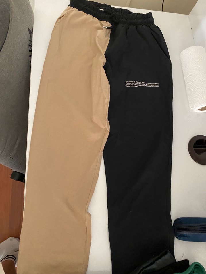 Bej ve siyah renk bloklu, lastikli bel detaylı rahat kesim kadın kumaş pantolon. Günlük kullanıma uygundur.