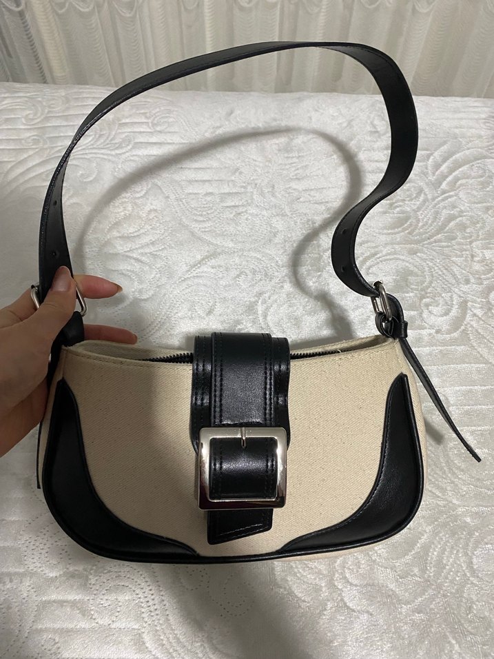Bej ve siyah deri omuz çantası, büyük tokasıyla dikkat çeker. Trendy casual ve sokak stiline uygun, günlük kullanıma idealdir.